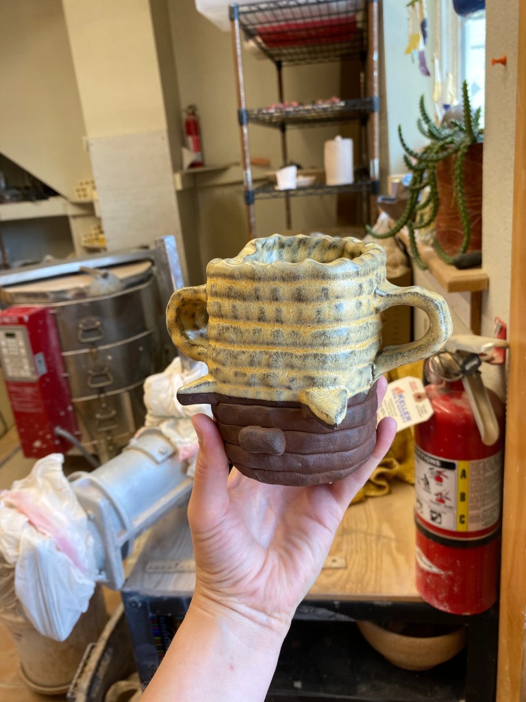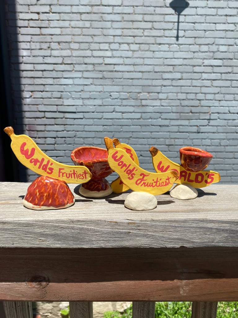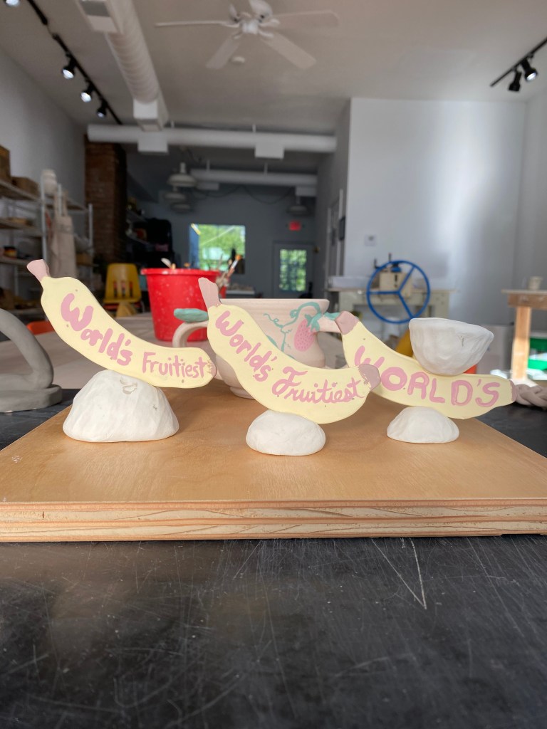 This is a snapshot of what I’ve been working on this year. My intention for my work this year was for it to become more playful. I wanted to release the stress and pressures I put on myself during my residence that ended in summer 2023. For the year following the residency, I struggled to capture a sense of carefree play that I was craving. This year, I started teaching kids classes, and these experiences completely changed my relationship to clay. It allowed me to go back to basics and just have fun with it! Making gnomes, cupcakes, and turtles really brought me out a rut, and now I’m having fun making many fruit themed things.